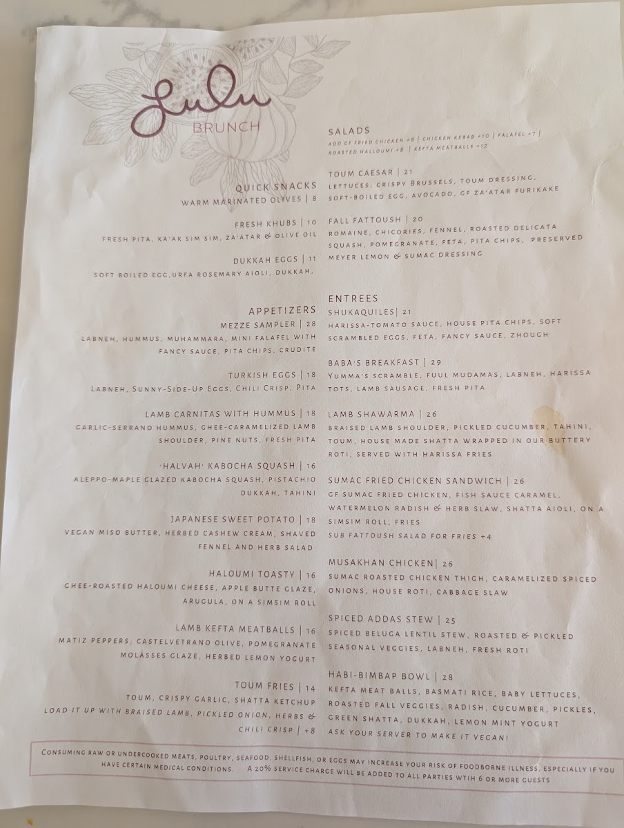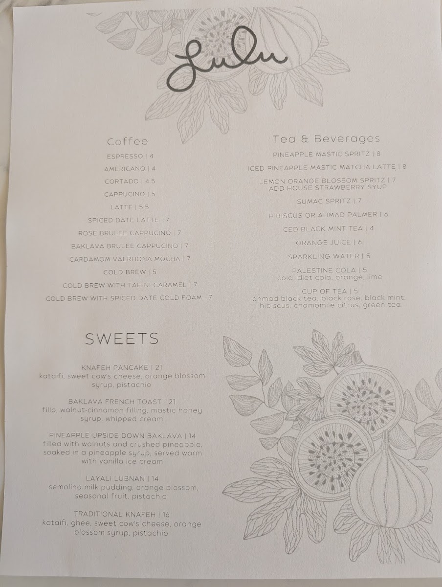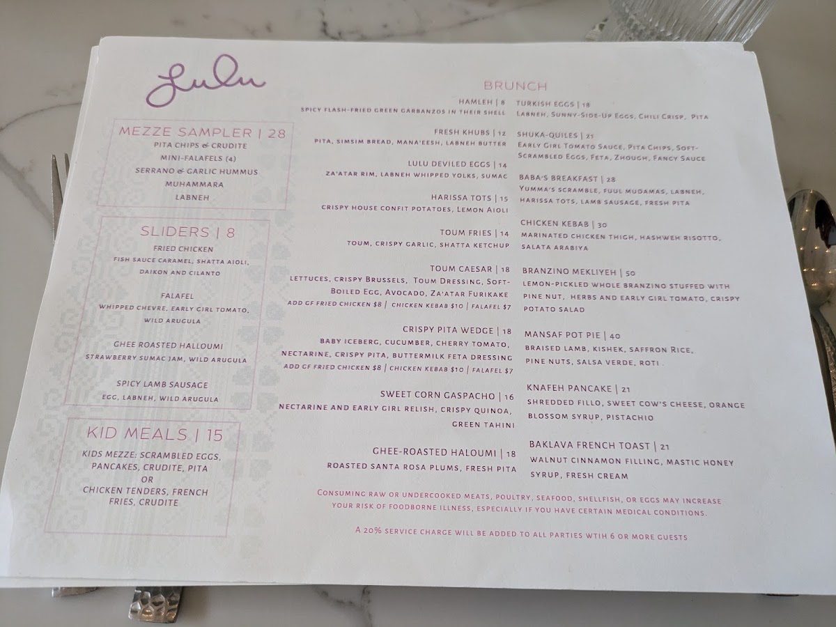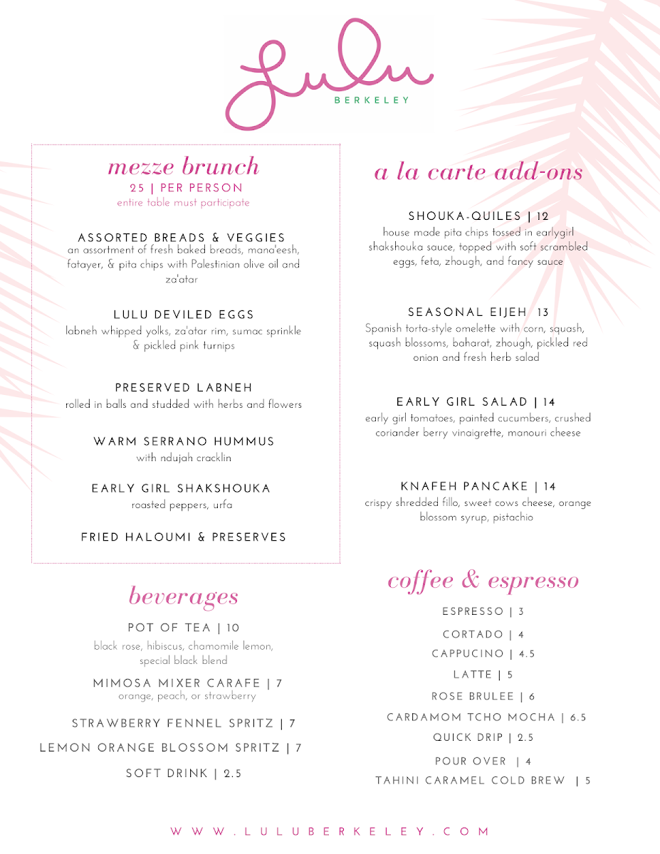 Lulu offers a thoughtfully composed menu that bridges casual brunch favorites with Middle Eastern influences, creating a welcoming spot for both laid-back mornings and relaxed dinners. The selection blends approachable dishes with creative flavors, emphasizing fresh ingredients and lively textures that complement the restaurant’s bright, colorful atmosphere.